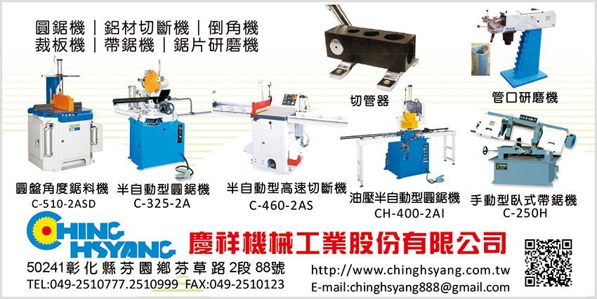 金屬圓鋸機、鋁材切斷機、倒角機、裁板機、立式帶鋸機、鋸片研磨機、臥式帶鋸機、油壓半自動型圓鋸機、數控型自動角度圓鋸機、管料圓棒雙端倒角機、圓盤角度鋸料機、NC全自動高產能鋸料機、鎢鋼圓鋸片研磨機、HSS圓鋸片研磨機、立式萬能帶鋸機、NC數控型自動圓鋸機、半自動型圓鋸機、金屬圓管/圓棒端面加工倒角機、管料雙端倒角機、鋸片