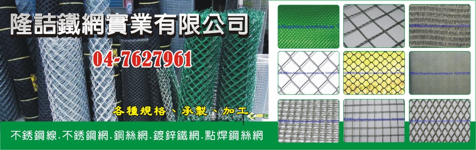 服務項目:菱形網、平織網、浪形網、不銹鋼網、不銹鋼線、銅絲網、點銲網、鍍鋅鐵網、點焊鋼絲網、沖孔網、紗窗網、萬能網、遮光網、尼龍網、割刀刺網、客製廚具配件、鍍鋅鐵絲網、工業用網、黃紅銅絲網、各種規格金屬網、金屬網承製、金屬網加工...等。
