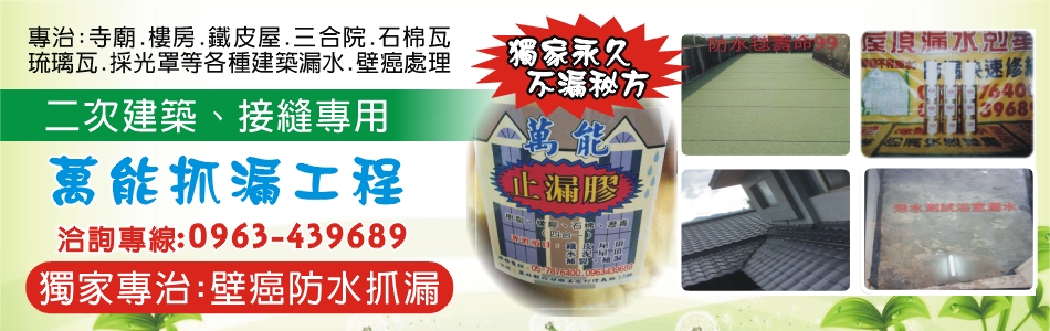經營項目:萬能止漏膠、壁癌防水抓漏、寺廟防水抓漏、樓房防水抓漏、屋頂防水抓漏、壁癌處理、鐵皮屋抓漏、浴室防水、三合院防水、三合院抓漏、琉璃瓦防水、採光罩漏水...等各式漏水工程。