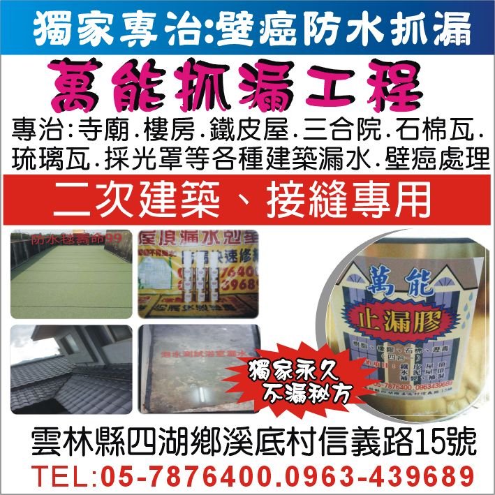 經營項目:萬能止漏膠、壁癌防水抓漏、寺廟防水抓漏、樓房防水抓漏、屋頂防水抓漏、壁癌處理、鐵皮屋抓漏、浴室防水、三合院防水、三合院抓漏、琉璃瓦防水、採光罩漏水...等各式漏水工程。