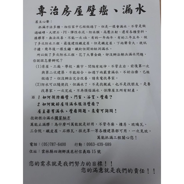 萬能抓漏工程專長於各種建物之抓漏及防水工程,經營項目:雲林防水、雲林抓漏、四湖防水抓漏、嘉義防水、嘉義抓漏、北港防水抓漏、土庫防水抓漏、虎尾防水抓漏、斗南防水抓漏、斗六防水抓漏、崙背防水抓漏、西螺防水抓漏、麥寮防水抓漏、莿桐防水抓漏、水林防水抓漏、褒忠防水抓漏、東勢防水抓漏、四湖防水抓漏、台西防水抓漏、元長防水抓漏、布袋防水抓漏、太保防水抓漏、中埔防水抓漏、水上防水抓漏、大埔防水抓漏、溪口防水抓漏、番路防水抓漏、梅山防水抓漏、竹崎防水抓漏、阿里山防水抓漏、鹿草防水抓漏、朴子防水抓漏、東石防水抓漏、六腳防水抓漏、新港防水抓漏、民雄防水抓漏、大林防水抓漏、義竹防水抓漏、萬能止漏膠、壁癌防水抓漏、寺廟防水抓漏、樓房防水抓漏、屋頂防水抓漏、壁癌處理、鐵皮屋抓漏、浴室防水、三合院防水、三合院抓漏、琉璃瓦防水、採光罩漏水、抓漏達人、各式漏水工程、萬能抓漏、止水工程、構造物的漏水診斷、建築物防水、外牆防水、屋頂防水工程、建築物抓漏、廟宇防水、學校防水、公司行號防水工程、辦公大樓防水工程,給您十年的保固,品質保證~