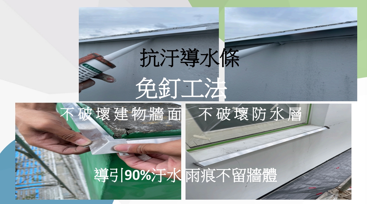 除了外牆塗料的施做,一定要搭配滴水條,確保牆面不受雨水髒汙的附著,滴水條獨家專利,不會影響牆面外觀及也不會破壞牆面。