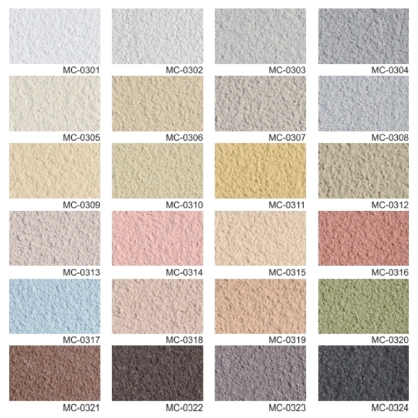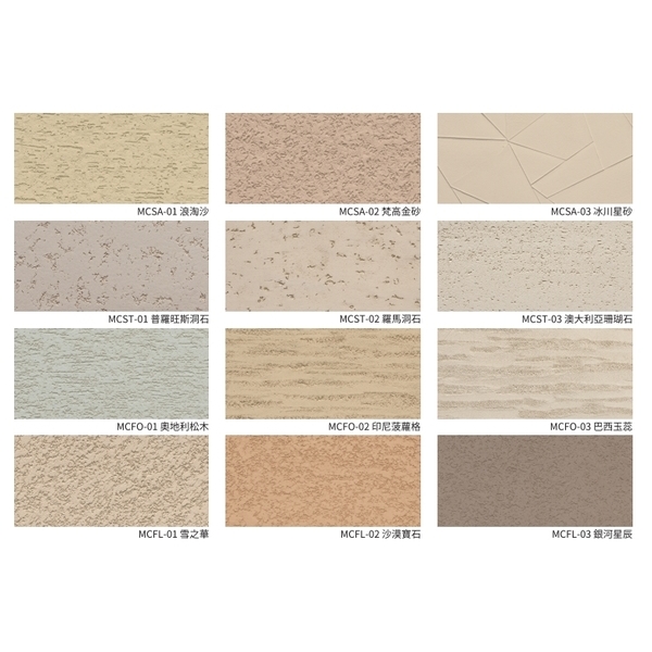 由高耐候乳液配合陶器細砂及不同的石英砂粒徑大小和形狀,研製出數十種,風格多變,工法、設計調整彈性大,展現多元創意。