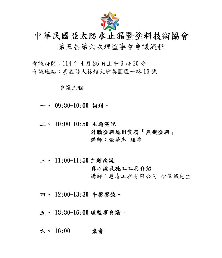 中華民國亞太防水止漏暨塗料技術協會,主題演說無機塗料、真石漆及施工工具!