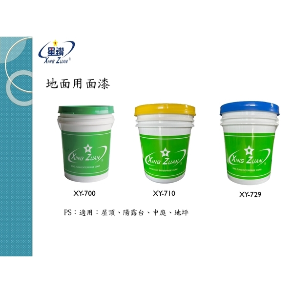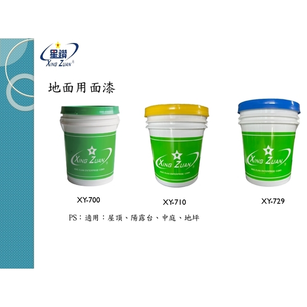 地面用面漆/型號:XY-700、XY-710、XY-729/建議用途:屋頂、陽露台、中庭、地坪。