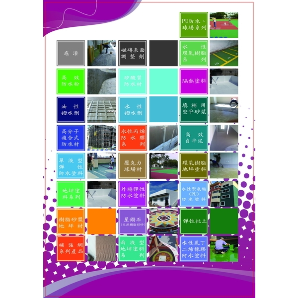 防水塗料、外牆拉皮、內牆裝飾塗料、斷熱塗料、地坪材、球場材、止滑、磁磚、橡膠墊、隔音、聚胺酯、地坪、水性防水材、自癒型防水添加劑、樓板隔音墊、橡膠緩衝材、水性壓克力球場材、水性樹脂砂漿地坪材、水性聚氨酯、矽酸質防水粉、天然彩砂、自黏熱熔式防水毯、水性奈米底漆、強化底漆、外牆油漆、耐黃變透明漆、磁磚表面接著劑、油性撥水劑、橡化瀝青防水膠、高分子複合式防水材、水性丙烯瀝青防水膠、不垂流瀝青防水膠、防水工程、透明、止滑、紙模、乾式、水性金油、水性壓克力跑道、兩液型水性壓克力、紋理塗料、清水模塗料、聚氨酯地坪材、樹脂砂漿地坪材、EPOXY、玻璃纖維網、壓克力球場、單液彈性防水塗料、粗糙面單液彈性防水塗料、水和凝固型防水材、防水材料、隔熱防水塗料、氯丁橡膠、耐磨地板、黑膠、抗張不織布壓克力球場材、屋頂防水、環氧樹脂、丙烯酸樹脂、自黏式防水毯、防水漆、固化劑、壓克力彩色面層、高性能斷熱塗料、外牆彈性防水塗料、外牆彈性中塗、熱熔式改質瀝青防水毯、抗張不織布、自黏式防水膜、岩片面防水毯、熱熔式改質防水毯、底油、穿孔不織布、壓克力球場材、彈性批土、磁磚保護漆、油性潑水劑、地坪防水塗料、透明防水塗料、劃線漆、耐黃變透明漆、隔熱防水塗料、熱熔式改質瀝青防水毯、自黏防水膜
