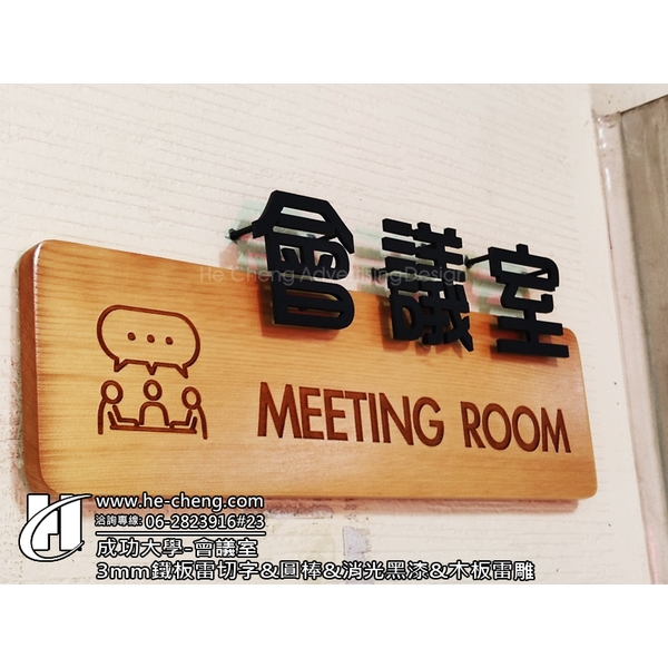 成功大學會議室-3mm鐵板雷切字、圓棒、消光黑漆、木板雷雕產品說明