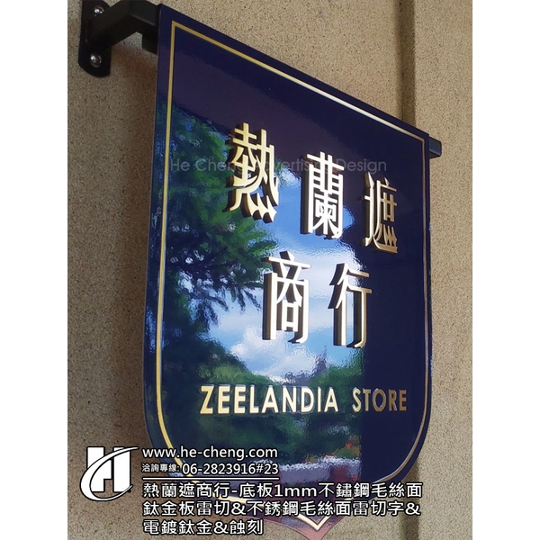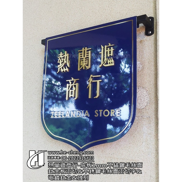 熱蘭遮商行-牆面旗子造型招牌、底板1mm不鏽鋼毛絲面鈦金板雷切、不銹鋼毛絲面雷切字、電鍍產品說明