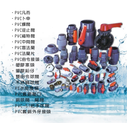 PVC凡而、PVC-ST把手球閥、球閥、銅球塞凡而、雙由令球閥、PVC逆止閥、PVC福特閥、PVC中間閥、PVC蝶閥、PVC法蘭片、PVC由令接頭、PVC水塔接頭、PVC套銅龍口、PVC套銅外牙接頭、PVC卜申、PVC盲法蘭、塑膠塞頭、塑膠鉛仔、銅球閥、閘閥、不銹鋼球閥、逆止閥、蝶閥、法蘭片、銅逆止閥類、接頭、排氣閥、全流量球塞閥、束口接頭、橫式逆止閥、銅球塞、銅牙閥接、ST束口彎、固定片、蝶型球塞閥、內外牙球塞閥、標準型球塞閥、套銅龍口彎、耐高壓軟筒凡而、PVC塑膠接頭、套銅接頭另件、落水頭、一體式球塞閥、試壓閥、閥類、安全閥、考克、針閥、快速接頭、平衡閥、氧氣瓶閥、金屬零件、球頭、電磁閥、球形閥、止回閥、PE水塔接頭、水電接頭配件、台中金屬零件、台中落水頭、台中pvc凡而、台中各式閥類、台中水電接頭配件