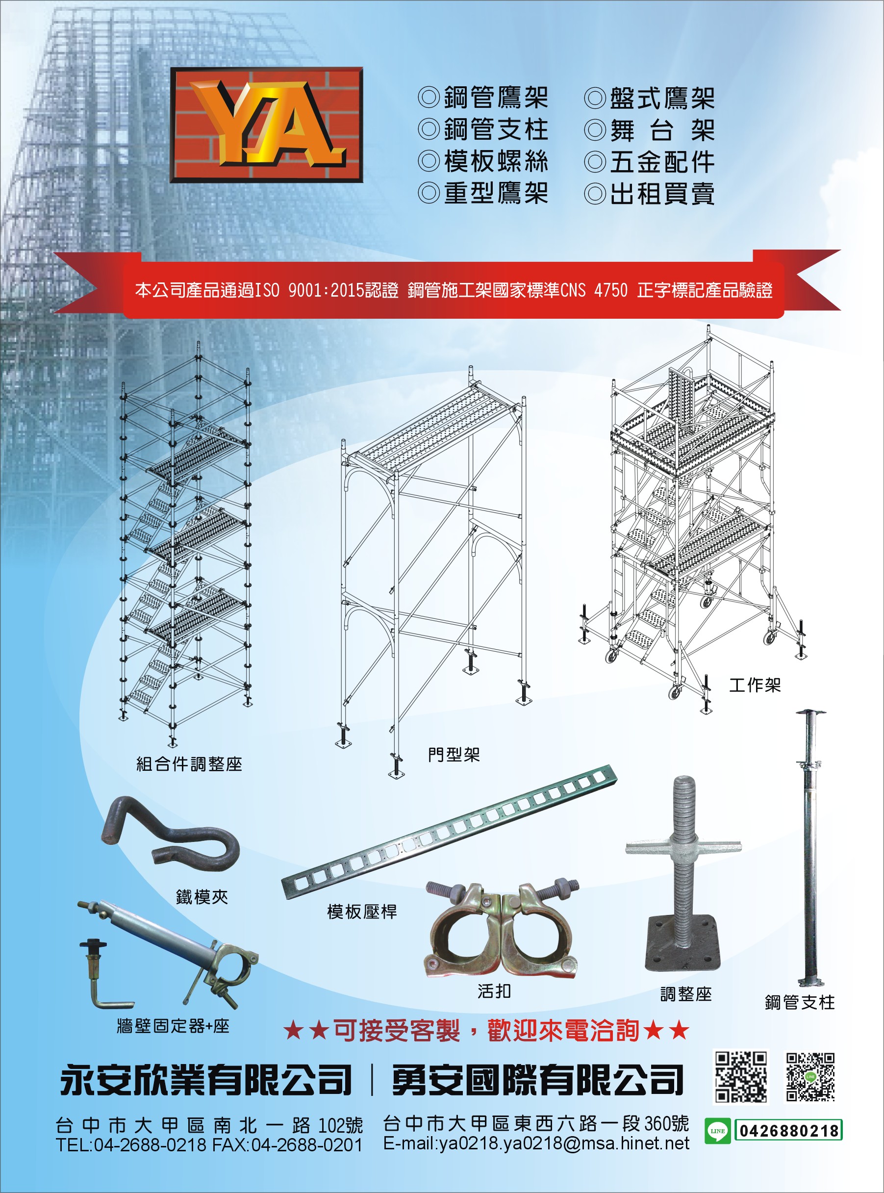 ※經營項目:鷹架出租買賣、鋼管鷹架、鋼管支柱、模板螺絲、重型鷹架、盤式鷹架、舞台架、五金配件、鋼管工作架出租買賣、活扣、牆壁固定器+座、管束、鐵模夾、調整座、系統模板、清水模、金屬建築結構、鷹架組件、螺絲、螺帽、螺絲釘、塑膠皮、塑膠布、塑膠板、塑膠管材、五金批發、結構工程、鍍鋅踏板、工作架、活動踏板、鷹架輪、交叉拉桿、平行調整座、U型調整座、平型調整座...等。