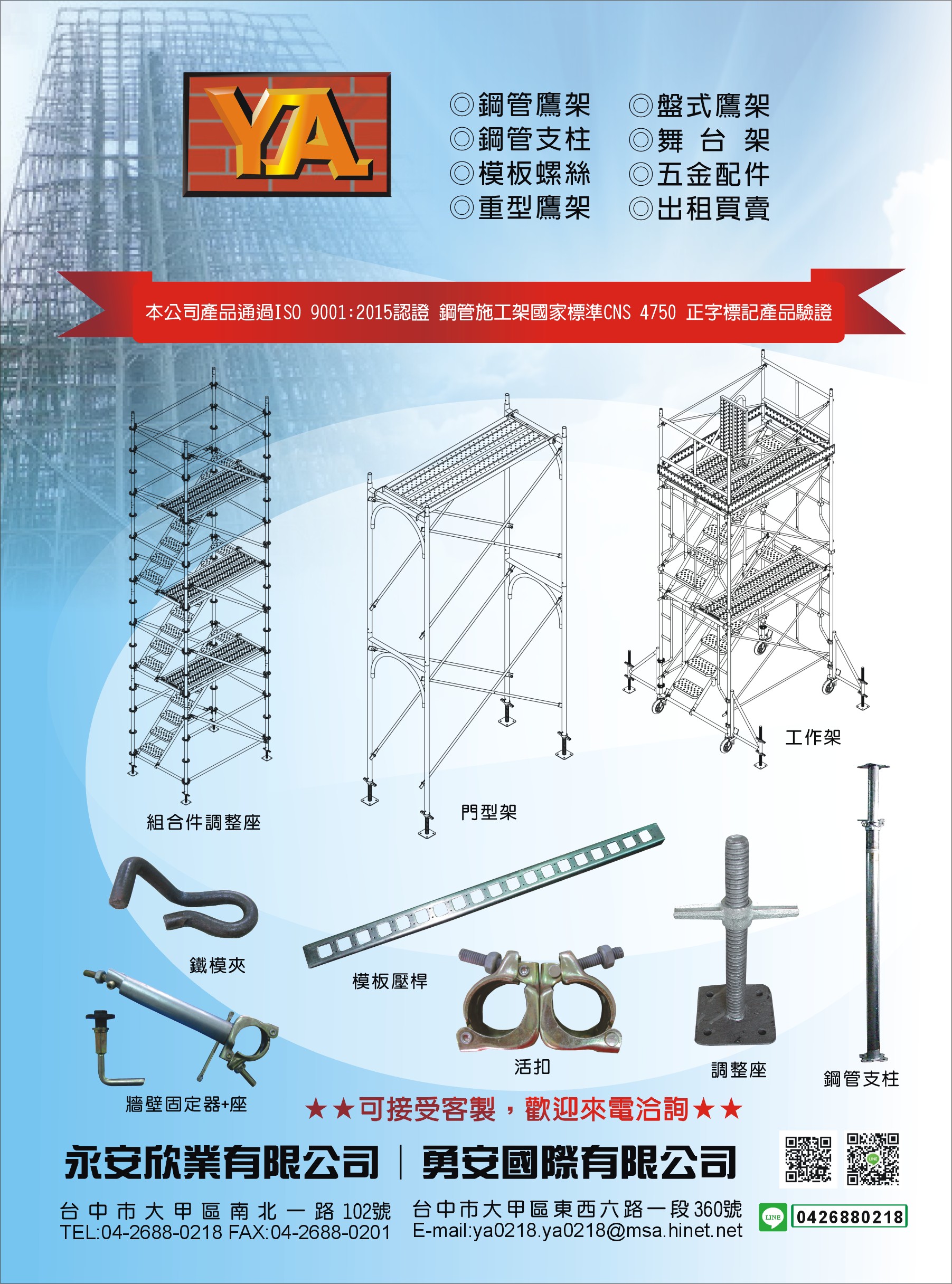 鷹架出租買賣、鋼管鷹架、鋼管支柱、模板螺絲、重型鷹架、盤式鷹架、舞台架、五金配件、鋼管工作架出租買賣、活扣、牆壁固定器+座、管束、鐵模夾、調整座、系統模板、清水模、金屬建築結構、鷹架組件、螺絲、螺帽、螺絲釘、塑膠皮、塑膠布、塑膠板、塑膠管材、五金批發、結構工程、鍍鋅踏板、工作架、活動踏板、鷹架輪、交叉拉桿、平行調整座、U型調整座、平型調整座、牆壁固定器、牆壁固定座、台中鋼管鷹架、台中鋼管支柱、台中模板螺絲、台中重型鷹架、台中盤式鷹架、台中舞台架、台中五金配件、重型鷹架、圓盤系統架、門型架、工作架、模板壓桿、牆壁固定器座、鋼管施工架