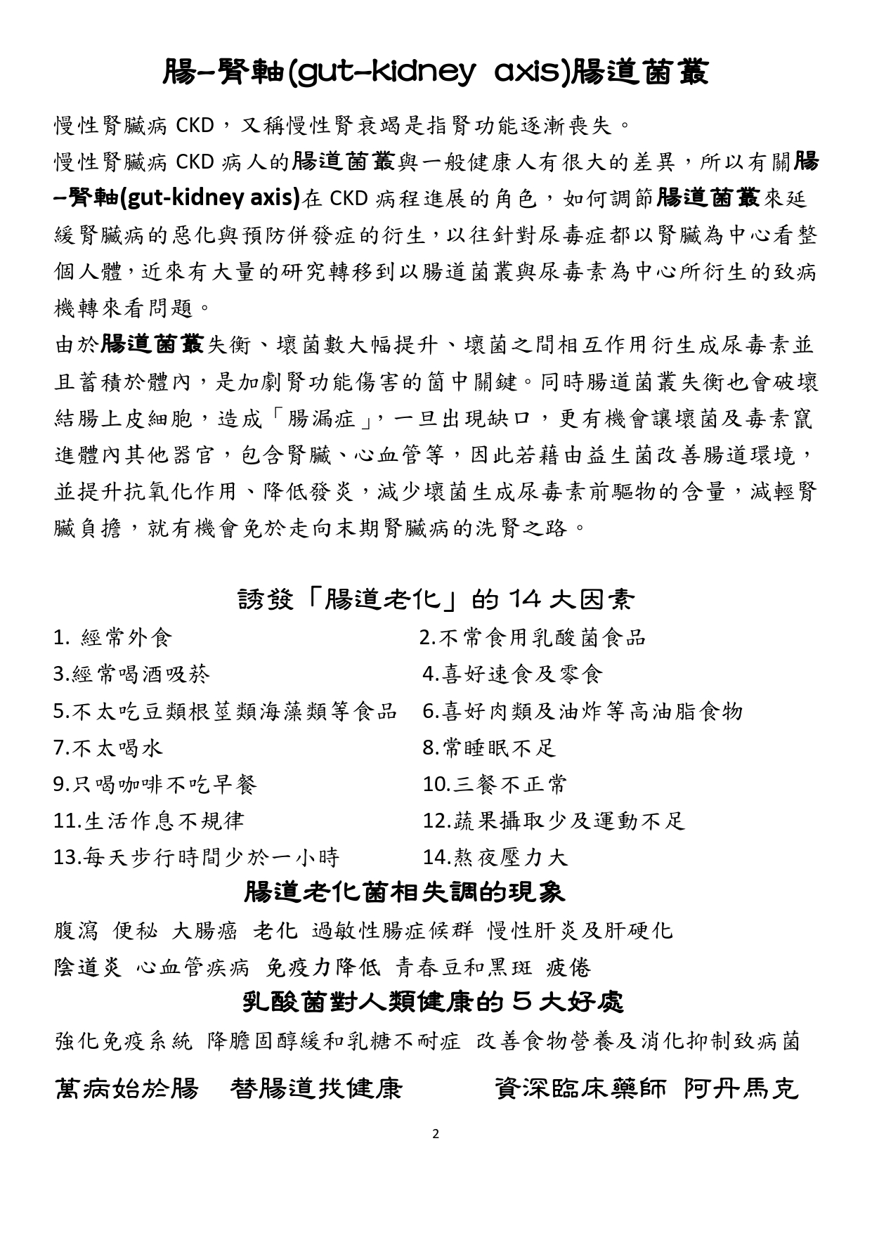 慢性腎臟病CKD病人的腸道菌叢與一般健康人有很大的差異,所以有關腸一腎軸(gut-kidney axis)在CKD病程進展的角色,