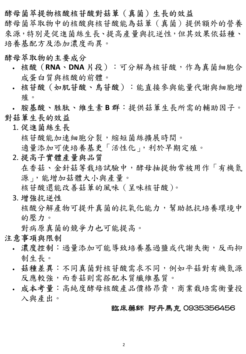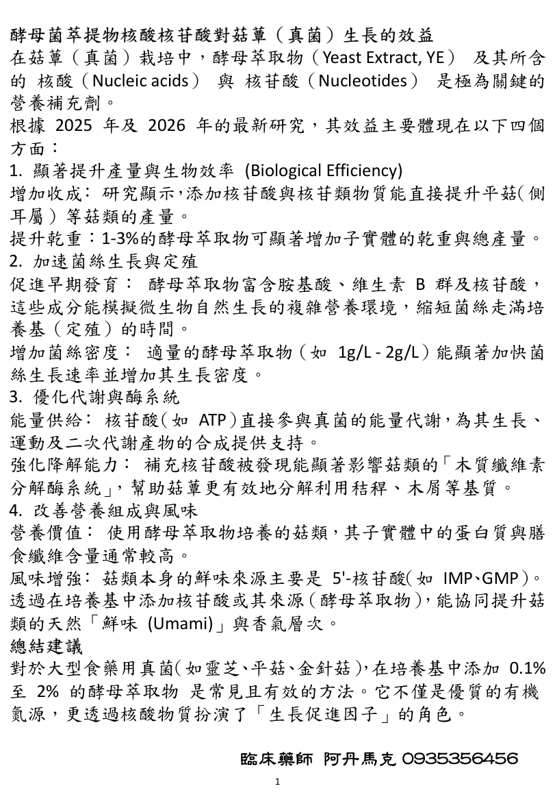 酵母菌萃取物中的核酸與核苷酸能為菇蕈(真菌)提供額外的營養來源,特別是促進菌絲生長、提高產量與抗逆性,但其效果依菇種、培養基配方及添加濃度而異。