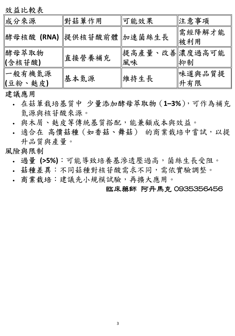 ・成本考量:高純度酵母核酸產品價格昂貴,商業栽培需衡量投入與產出。