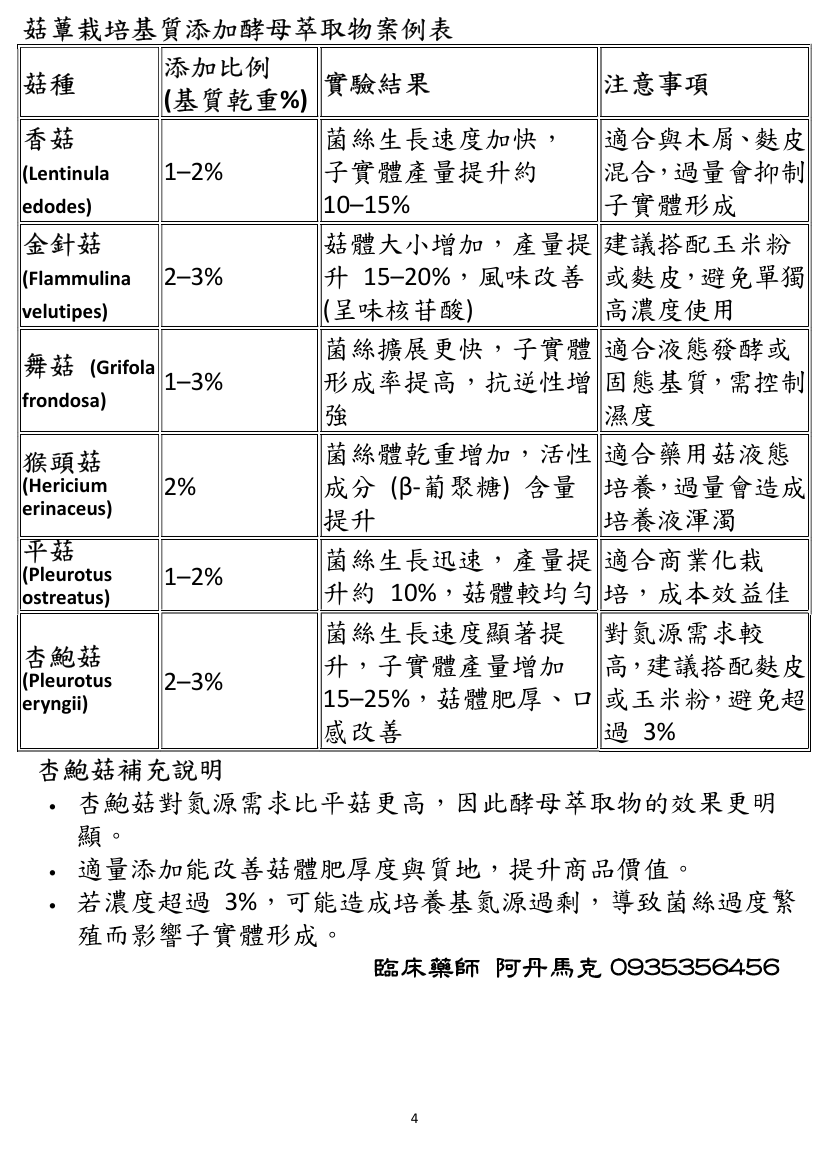 ・在菇蕈栽培基質中少量添加酵母萃取物(1-3%),可作為補充氮源與核苷酸來源。
