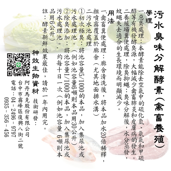 2.除臭添加:將池容量1/1000的本品,加入集尿池或污水處理池。約每十日一次(例如池容量6噸則本品用6公升) 註:酵素新鮮效果最佳,請於一年內用完。