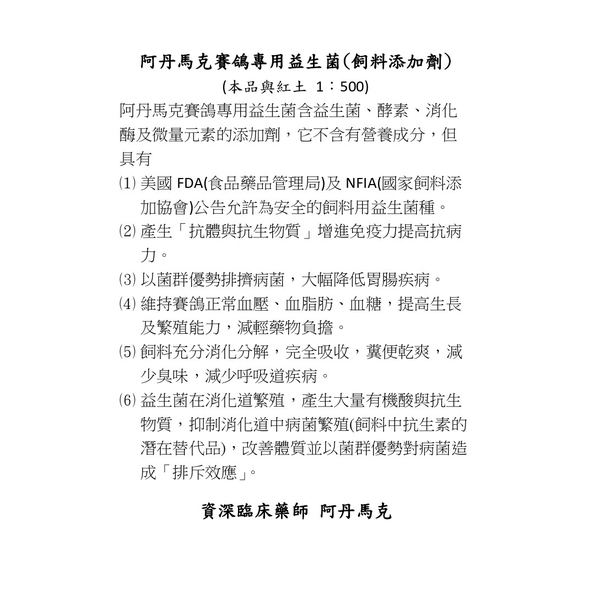 阿丹馬克賽鴿專用益生菌(飼料添加劑)產品說明