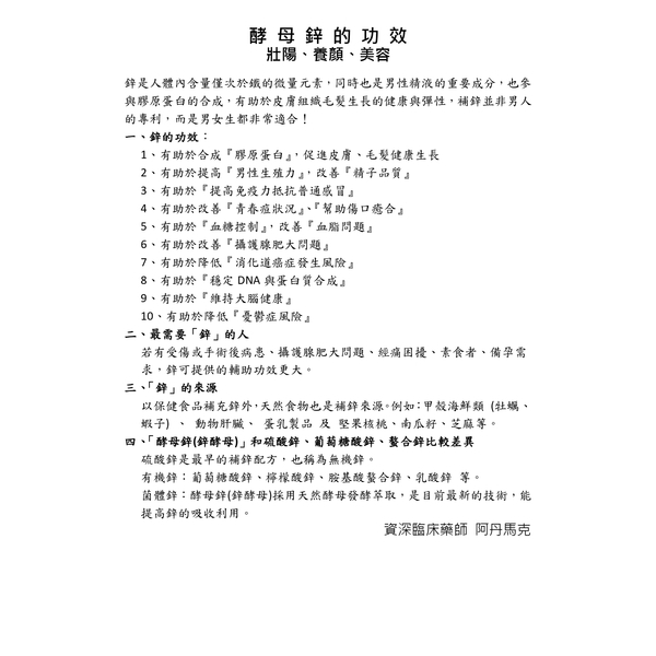 L-精氨酸 L-Arginine & 鋅酵母 Zinc Yeast產品說明