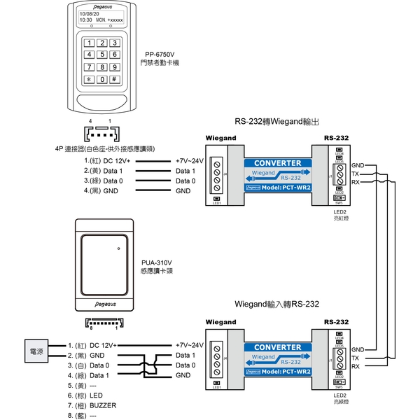 自動識別,轉換器使用DC 7V~24V 電源供電,可直接使用門禁控制器的維庚輸入埠的DC 12V