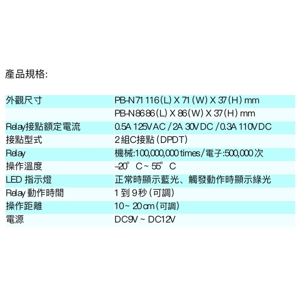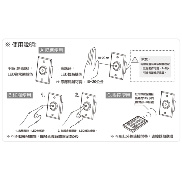 ◎ 常態為藍⾊色LED,感應觸發時轉為綠⾊色LED容易易辨識。 此產品為近接式感應,⼿手不不⽤用碰觸表⾯面既衛⽣生⼜又⽅方便便。 觸發後延遲動作時間可調,從1 秒⾄至9秒。