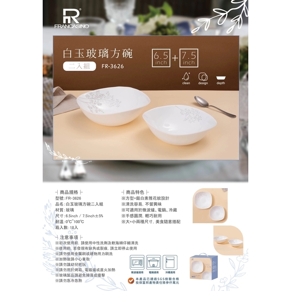 【FRANCASINO】白玉玻璃方碗二入組 FR-3626產品說明