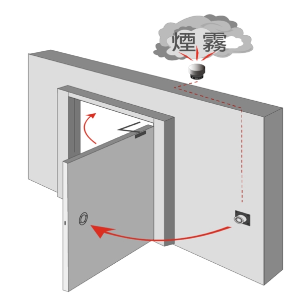 ▪️ 當偵測器偵測到火災或緊急狀況時, 會傳訊號使防煙門扣將吸附的鐵板放掉, 讓門弓器將門關起來, 防止濃煙蔓延至其他區域