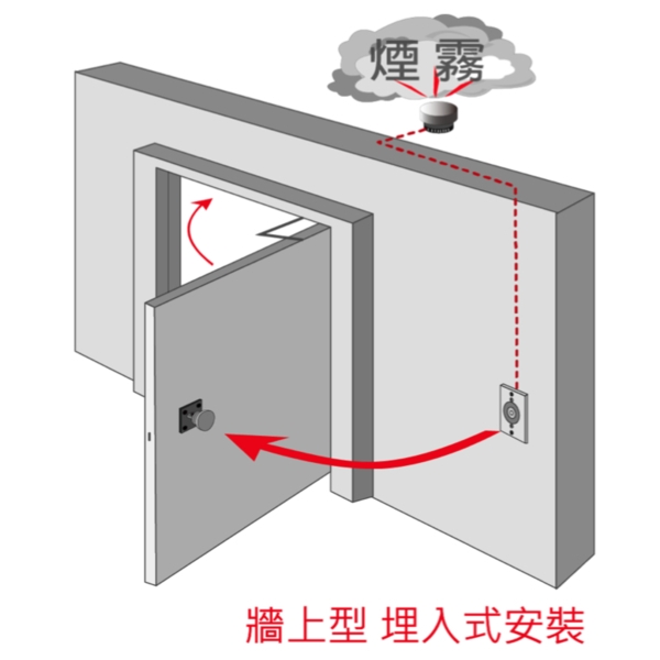 ■ 當偵測器偵測到火災或緊急狀況時, 會傳訊號使防煙門扣將原本吸附著的鐵板放掉, 讓門弓器將門關起來, 防止濃煙蔓延至其他區域