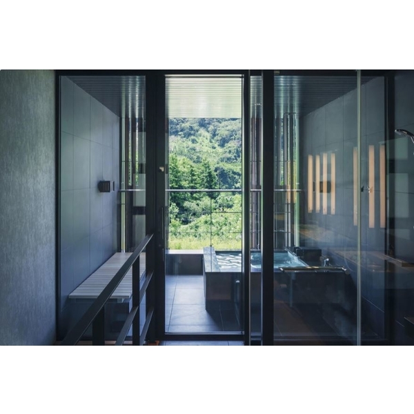 整體風格為禪意極簡導向日式極至美學,冷色系之貼磚降板保溫浴缸搭配俐落與臉盆檯面區暖色系形成對比,一明一暗展現柔中帶剛,位於半戶外湯屋區,以欄杆搭配YKK戶外窗、躺椅到浴缸區為一體成形防水底盤採同層排水,可避免流水聲影響樓下住戶,乾溼區無障礙門檻設計,總體凸顯出浴室前衛設計特性以及兼顧實用性。