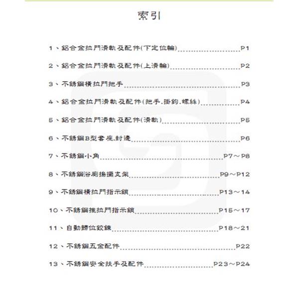 不銹鋼搗擺、建築五金、沖床製品、回歸絞鏈、浴廁門鎖、拉門滑軌、白鐵封邊、搗擺五金、指示鎖、螺絲、鉤鎖、把手、門止、下直通、浴廁五金、角鐵、康貝特板用五金、不銹鋼製品、鋁擠型、機械零件、滑輪、指示鎖檔板、檔板墊片、不銹鋼封邊、拉門滑軌組、拉門滑輪組、拉門下定位輪、拉門下定輪、內崁式把手、打掛鎖、安全型橫拉門指示鎖、門閂鎖、合金指示鎖、分離式指示鎖、圓型指示鎖、連結式指示鎖、適用於橫拉門、適用於推拉門、水晶橫拉門指示鎖、鋁合金指示鎖、水晶指示鎖、水晶定位型指示鎖、平下直通、L型大套蓋下直通、旗型鉸鍊、慶祥門鉸練、自動歸位鉸鍊、不銹鋼把手、不銹鋼塑膠蓋圓形小角組、蛋型下直通、U型定位孔目玉下直通、L型半盤(大盤)下直通、蝴蝶鉸鍊、蝴蝶鍊、掛鉤、L型小套蓋下直通、U型目玉下直通、壁虎、滾珠型龍凸珠、安全型雙向指示鎖、多功能指示鎖、方型塑膠把手、橫拉門隱藏式鉤鎖、組合式拉門滑軌組、平貼型自動歸位鉸鍊、高雄不鏽鋼製品、高雄安全型雙向指示所、高雄機械零件、不鏽鋼安全扶手、殘障扶手、鋁合金拉門滑軌、下定位輪、上滑輪、滑軌、不銹鋼橫拉門把手、不銹鋼B型套座、封邊、拉桿、不銹鋼小角、不銹鋼浴廁搗擺支架、不銹鋼橫拉門指示鎖、不銹鋼推拉門指示鎖、鉸鍊、不銹鋼安全扶手、集水槽、落水頭、滾輪成型機加工