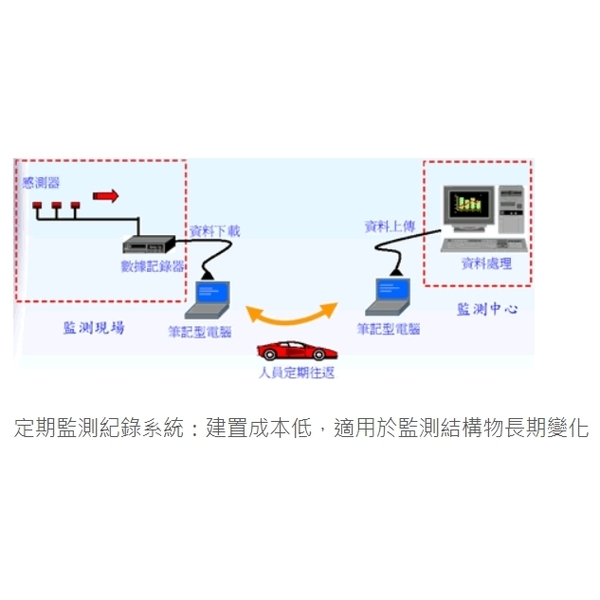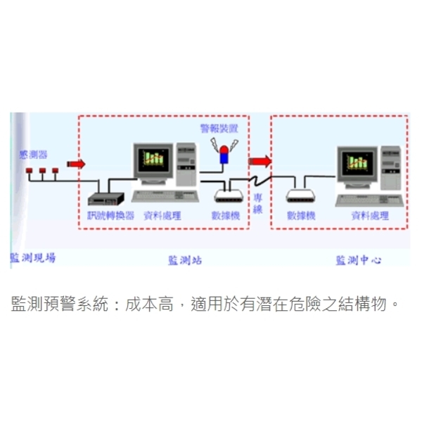 利用主從式分級結構監測系統,可任意設計使用於各種土木及建築構造物,做為長期監測結構變化及結合預警系統,適用範圍廣,可搭配各種不同的量測設備,如裂縫計應變規、傾斜計、相對沉陷計、地震加速計、數位式氣溫計、結合使用性強,可提供完整之監測、檢測方案,作業平台完整性佳。