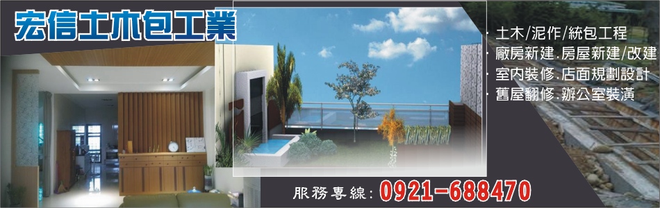 經營項目:景觀綠化工程、土木統包工程、房屋裝修、房屋整修、房屋改建、房屋新建、室內整修、辦公室裝修、舊屋翻修、舊屋翻新、店舖裝修、店面裝修、餐廳裝修、泥作工程、廣場鋪面...等。