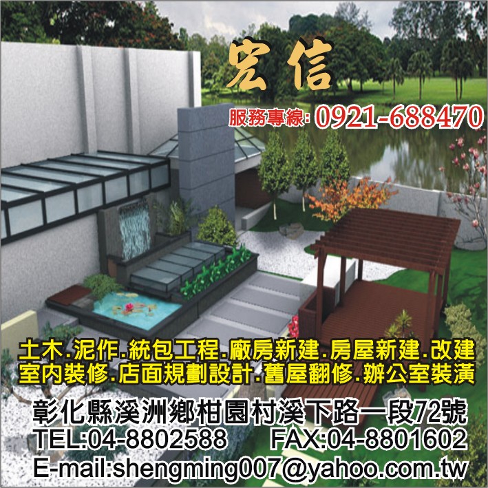 經營項目:景觀綠化工程、土木統包工程、房屋裝修、房屋整修、房屋改建、房屋新建、室內整修、辦公室裝修、舊屋翻修、舊屋翻新、店舖裝修、店面裝修、餐廳裝修、泥作工程、廣場鋪面、彰化土木工程、彰化泥作工程、彰化景觀工程、彰化房屋裝修、彰化室內整修、彰化店鋪裝修、彰化辦公室裝修、彰化圍牆施工、彰化廠房新建、彰化統包工程...等。