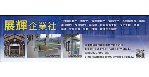 營業項目:不銹鋼自動門、推拉門、電動伸縮門、電動大門、不銹鋼柵欄、格柵、傳統捲門、快速捲門、帷幕牆、金屬鍛造工程、採光工程、鐵厝、鋼構、金屬圍籬、鋼板牆、各類不銹鋼、鐵件加工製造