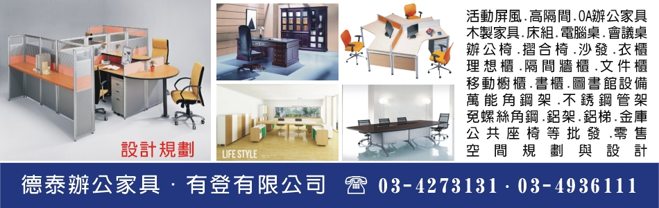 經營項目:OA辦公家具、辦公空間規劃、辦公桌、辦公椅、電腦桌、電腦椅、會議桌、資料櫃、分類垃圾桶、床組、衣櫃、理想櫃、移動櫥櫃、圖書館設備、萬能角鋼架、不銹鋼管架、量販、活動屏風、高隔間、鋁合金屏風、鋼木櫃、鋼木辦公桌、掀桌、下潛螢幕桌、牆櫃、A4抽屜型檔案架、文件櫃、塑鋼櫃、網椅、折合椅、人體工學椅、公共座椅、機場排椅、免螺絲角鋼架、鋁床、鋁架、鋁梯、金庫、保險櫃、沙發、主管桌、木製家具...等。