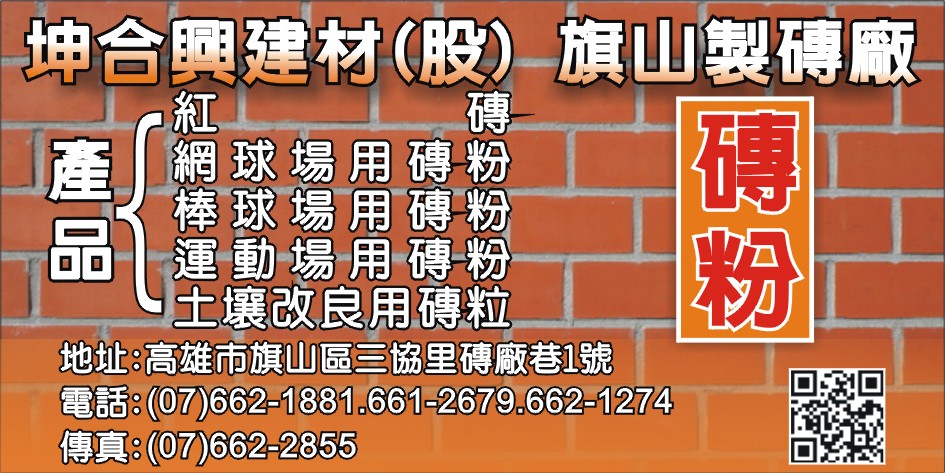 本公司地處高屏溪畔旗山鎮,具有最新設備之全自動磚廠.每日最高產量25萬塊磚,為南部具有高產量之紅磚工廠之一,另附有生產紅磚粉,每日最高產量50頓,為南部唯一附帶生產紅磚粉之紅磚工廠。