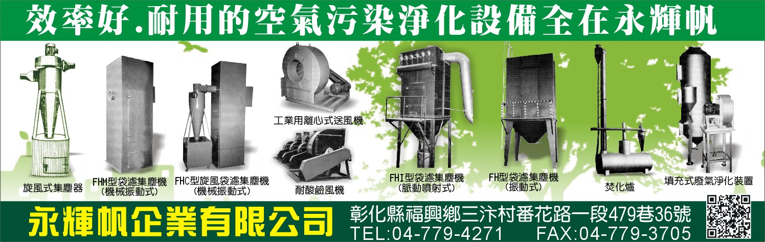 經營項目:空汙淨化設備、集塵設備、抽風機、通風管路、活性碳處理塔、屋頂排風機、噴砂台、水洗台、回收設備、空氣污染防治工程、旋風式集塵器、FHM型袋濾集塵機、FHC型炫風袋濾集塵機、工業用離心式送風機、耐酸鹼風機、FHI型袋濾集塵機、FH型袋濾集塵機、焚化爐、填充式廢氣淨化裝置、FHM型機械震動式集塵機、FHC機械振動式集塵機、FHI脈動噴射式集塵機、FH型振動式集塵機、空氣污染防治設備、空氣淨化、空汙防治...等。