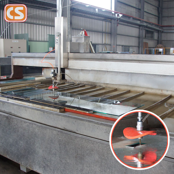 • 依客戶指定位置與尺寸,將水流以高壓方式噴出水柱以切割玻璃。