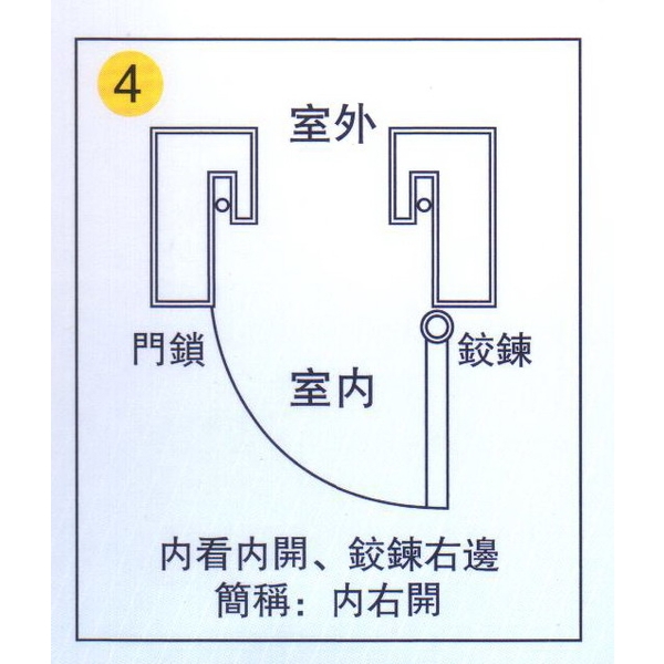 選對門的開啟方向,讓安裝更順利、安全無虞!本圖示清楚分類四種常見門的定位與固定方式,依據門扇開啟方向與鉸鍊位置進行區分。
