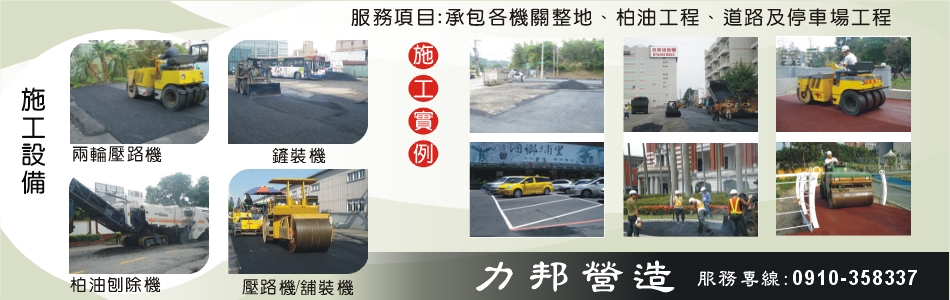 經營項目:整地、道路工程、停車場工程、柏油路工程、柏油舖設、瀝青舖設、柏油路重鋪、柏油刨除舖設、柏油瀝青舖設、彩色瀝青舖設、承包各機關整地、整地工程、排水溝、人行道舖設、壓路機、鋪裝機、柏油刨除機、鏟裝機、兩輪壓路機、級配整平、油壓三輪壓路機、油壓三輪舖裝機...等。