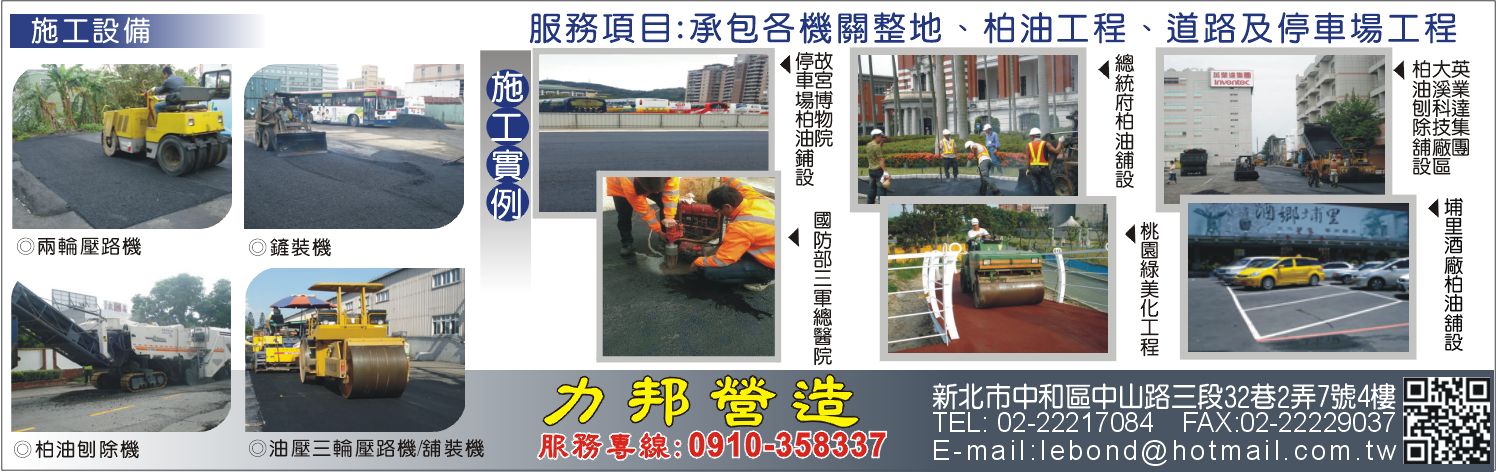 經營項目:整地、道路工程、停車場工程、柏油路工程、柏油舖設、瀝青舖設、柏油路重鋪、柏油刨除舖設、柏油瀝青舖設、彩色瀝青舖設、承包各機關整地、整地工程、排水溝、人行道舖設、壓路機、鋪裝機、柏油刨除機、鏟裝機、兩輪壓路機、級配整平、油壓三輪壓路機、油壓三輪舖裝機...等。