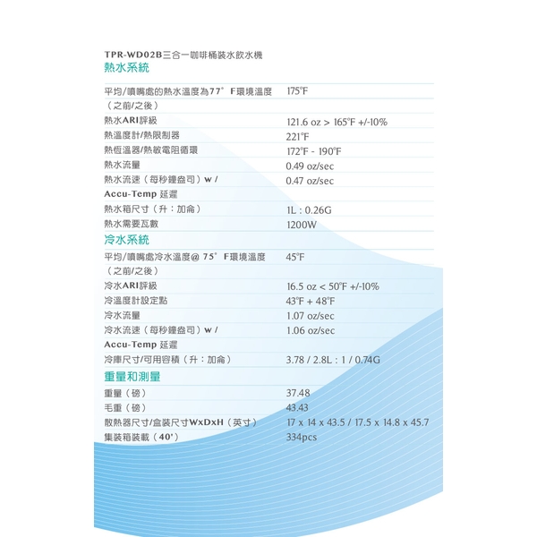 泰浦樂 冰熱飲水/咖啡泡茶機/桶裝水 TPR-WD02B產品說明