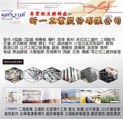 熱浸鍍鋅、鍍鋅、環保防鏽、防蝕鍍鋅、鋼管鐵管、鐵材鐵件、鷹架、角鐵槽鐵、方管扁管、花板鐵板、緊固件、螺絲螺帽、螺釘木釘、格柵板、水溝蓋、燈柱燈桿、太陽能、營建材料、連接板、橋樑、鋼構、護欄板、環保工程、綠建材、配件鍍鋅、管束、鉚釘墊片、鑄鐵件、鐵塔電信架、扁鐵、管件、型鋼、板材、各式加工鐵件工程配件、花窗、各式螺栓、螺帽、螺釘、木釘、整圈華司、鑄鋅鐵件、小型五金緊固件、廠房隔音牆、公共工程隔音牆、太陽能架、各類素材角鐵、花板、槽鐵等之加工鍍鋅處理、專業熱浸鍍鋅廠、H型鋼、C型鋼、欄杆、各式加工鐵件、工程配件、高速公路隔音牆、有縫鋼管、無縫鋼管、鋼筋、護欄管、溫室架、環片工程、高樓管件、廠房構件、管件鍍鋅、鐵路集電架、鐵路配件、太陽能綠屋頂、管線架、電信鐵架、電聯車高壓線架、道路隔音牆