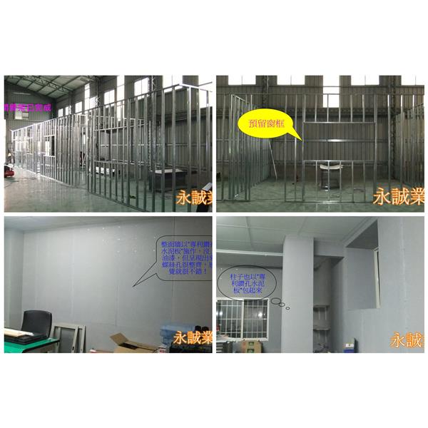 永誠業公司成立於民國95年,主要專於室內防火輕隔間、輕鋼架、溼式隔間工程、灌漿鋼網牆、及室內裝修壁紙及枕木地磚..等。