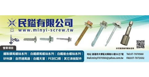 『民鎰有限公司』成立於民國88年3月,專精於各種螺絲製造與銷售,有嚴格的管理制度、優良的品質控管及生產效率的提高,近年來為服務客戶要求致使公司產品多元化,舉凡矽利康、白鐵天窗、通風器、水槽架等浪板工程用週邊配件均有銷售,以滿足廣大客戶之需求。