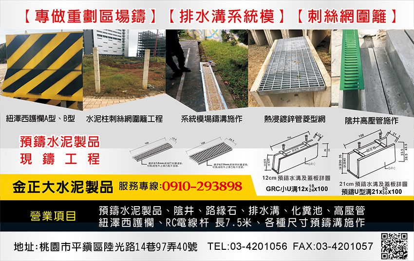 紐澤西護欄、水泥柱刺網圍籬、系統模場鑄溝、熱浸鍍鋅管菱形網、陰井高壓管、預鑄水泥製品、陰井、路緣石、排水溝、化糞池、高壓管、RC電線杆、GRCU型溝、水泥製品、預鑄U型溝、預鑄水溝、U型溝、刺網圍籬、刺線柱、圍牆柱、圍牆板、中央分隔島、高壓管紐澤西護欄、A型鋼筋混凝土管、B型鋼筋混凝土管、現場鑄工程、水溝蓋、涵管、A型紐澤西護欄、B型紐澤西護欄、蓋板、鋼筋混凝土管、桃園水泥製品、桃園預鑄U型溝、桃園陰井、桃園紐澤西護欄、北部水泥製品、北部刺網圍籬、北部紐澤西護欄、北部高壓管