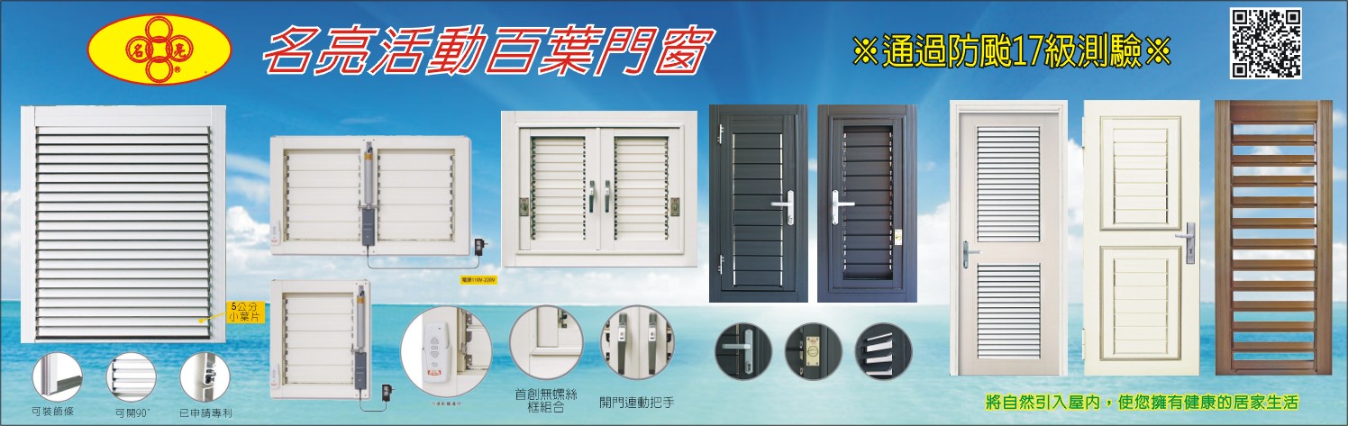 在地經營,專業生產製造名亮牌電動百葉窗、活動百葉門窗、室外百葉窗、遮陽百葉窗、遮陽活動百葉窗、防颱活動百葉窗、活動百葉門、通風門、電動百葉窗、消防百葉窗...等。