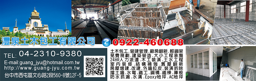 土木包工、舊屋翻新、防水抓漏、外牆拉皮、結構補強、廠房翻新、木工裝潢、土水工程、室內裝修、擋土牆、房屋增建、改建翻修、水電、鐵工、輕鋼架、鋼構、泥作、鐵棟、裝潢拆除、拆除、房屋新建、房屋興建、增建改建、房屋翻修、房屋裝潢、24小時人力派遣、Epoxy地坪、庫板、水溝、AC地坪、建築營造大小工程承攬、耐燃二級輕鋼架、隔音粉體烤漆印花防火級鋼門、止滑面EPOXY、粗面EPOXY、地坪AC鋪設、台中房屋翻修、台中房屋興建、台中土木包工、台中室內裝修、台中舊屋翻新、台中土水工程、台中木工裝潢、台中防水抓漏、台中鐵工、台中人力派遣、台中鋼構、台中裝潢拆除、台外牆拉皮、登記字號:M90227-000