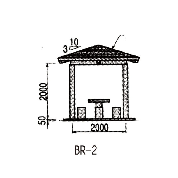 這款仿木涼亭結構高2000mm,寬度2000mm,附設座椅與桌面平台,屋頂斜面厚10mm。