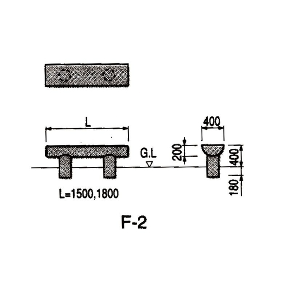 尺寸為長1500或1800mm,寬與高皆為400mm,底部埋入地面以下200mm,結構適用於需穩定支撐的景觀或設施基座。