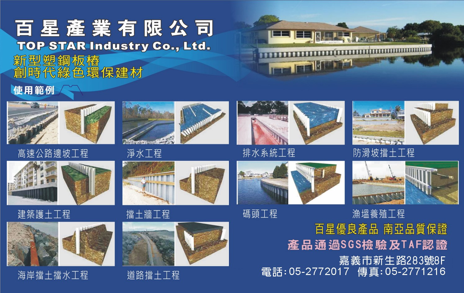 鑑於目前水患嚴重並窺見未來商機,將新一代防洪築堤擋土環保建材引進台灣,委由台塑集團南亞公司生產塑膠板樁,品質優良,符合ASTM、TAF及ISO認證。